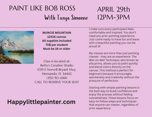 Join us at Betty's Creative Studio to make this beautiful oil painting with Tanya. Using the famous Bob Ross style of painting spend a few hours with Tanya, a certified Bob Ross Instructor to make this beautiful Oil Painting. All materials are included, just bring your apron and your enthusiasm.